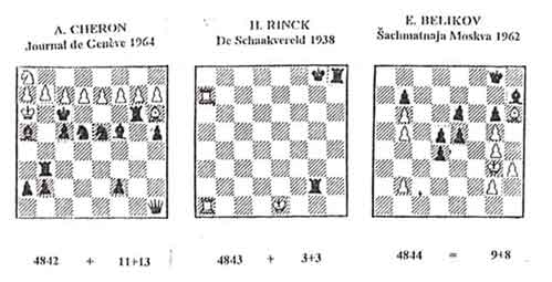 Pro pořádek sděluji že: pro celkový počet do pěti kamenů se používá ruského názvu „maljutki“. Do šesti nebo sedmi kamenů – jsou to miniaturky. Od osmi do dvanácti kamenů jsou to mereditky (Meredith 1835-1903, USA, skladatel). Pro větší počet kamenů se používá termín multistudie (autor studie, neznámý). Nejvzdálenější praktické hře je příklad číslo 4842. Cílem skladatele není nic jiného než vytvoření rekordu v proměnách pěšců v slabší figuru. Všechny studie tohoto typu jsou označovány slovem TASK.